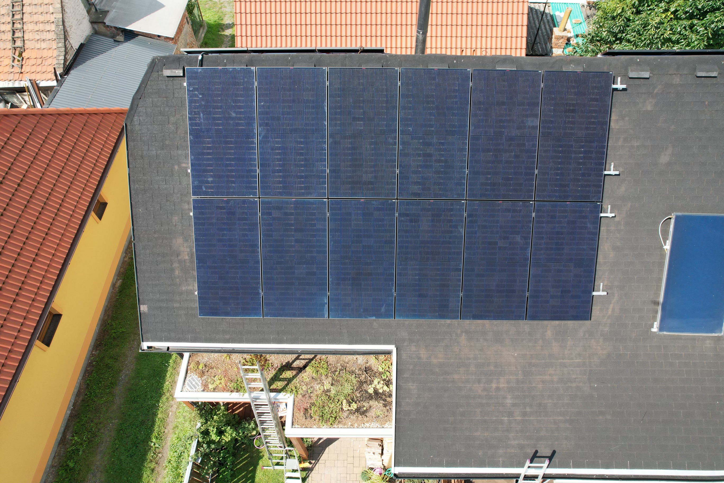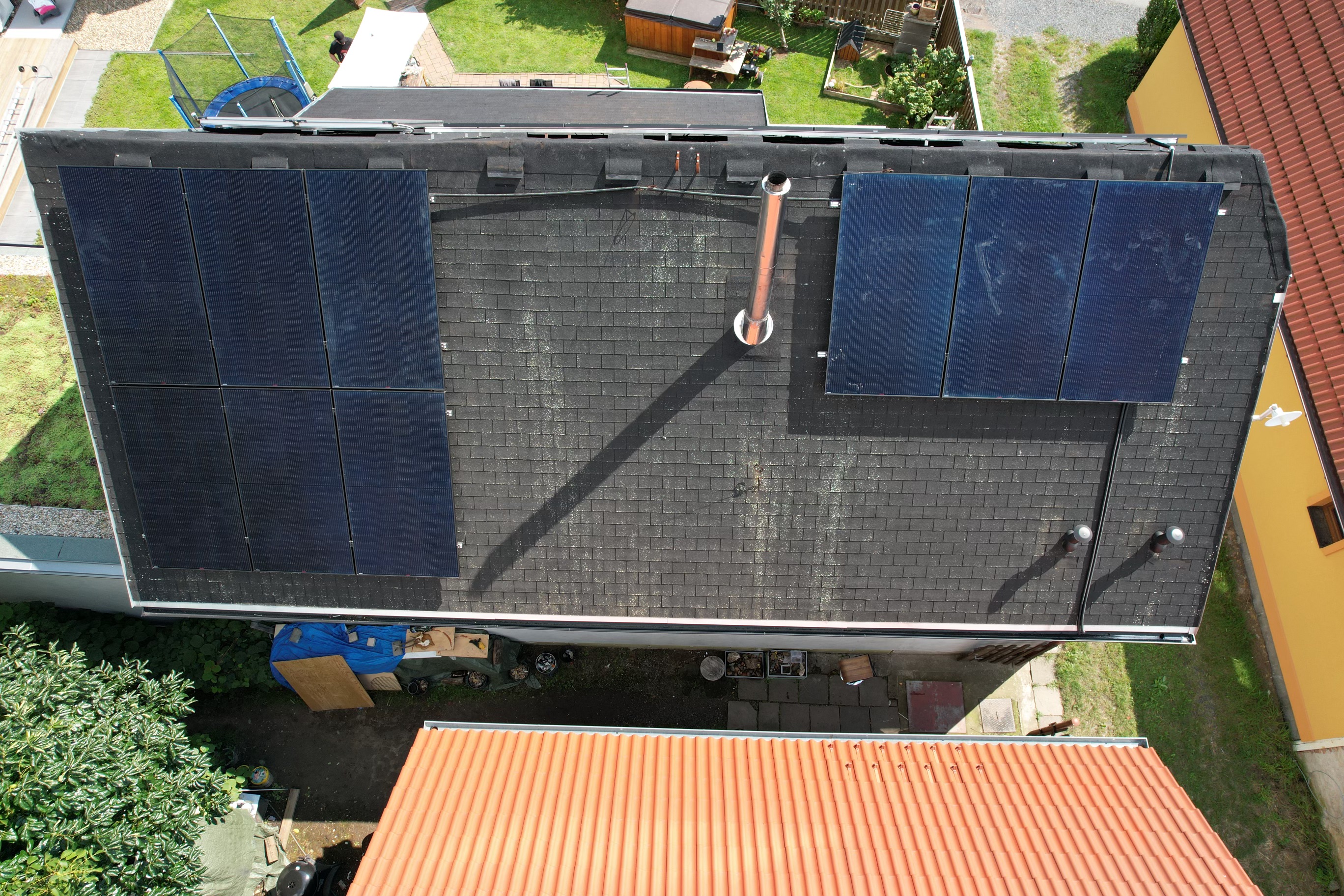 Instalace fotovoltaické elektrárny na rovné střeše rodinného domu o výkonu 10,2 kW. Střídače, MPPT regulátory, řídící jednotka Cerbo a dobíjecí stanice pro elektromobily od značky Victron Energy. Bateriové úložiště BPS BATTERY STORAGE o deklarované kapacitě 15 kWh.
