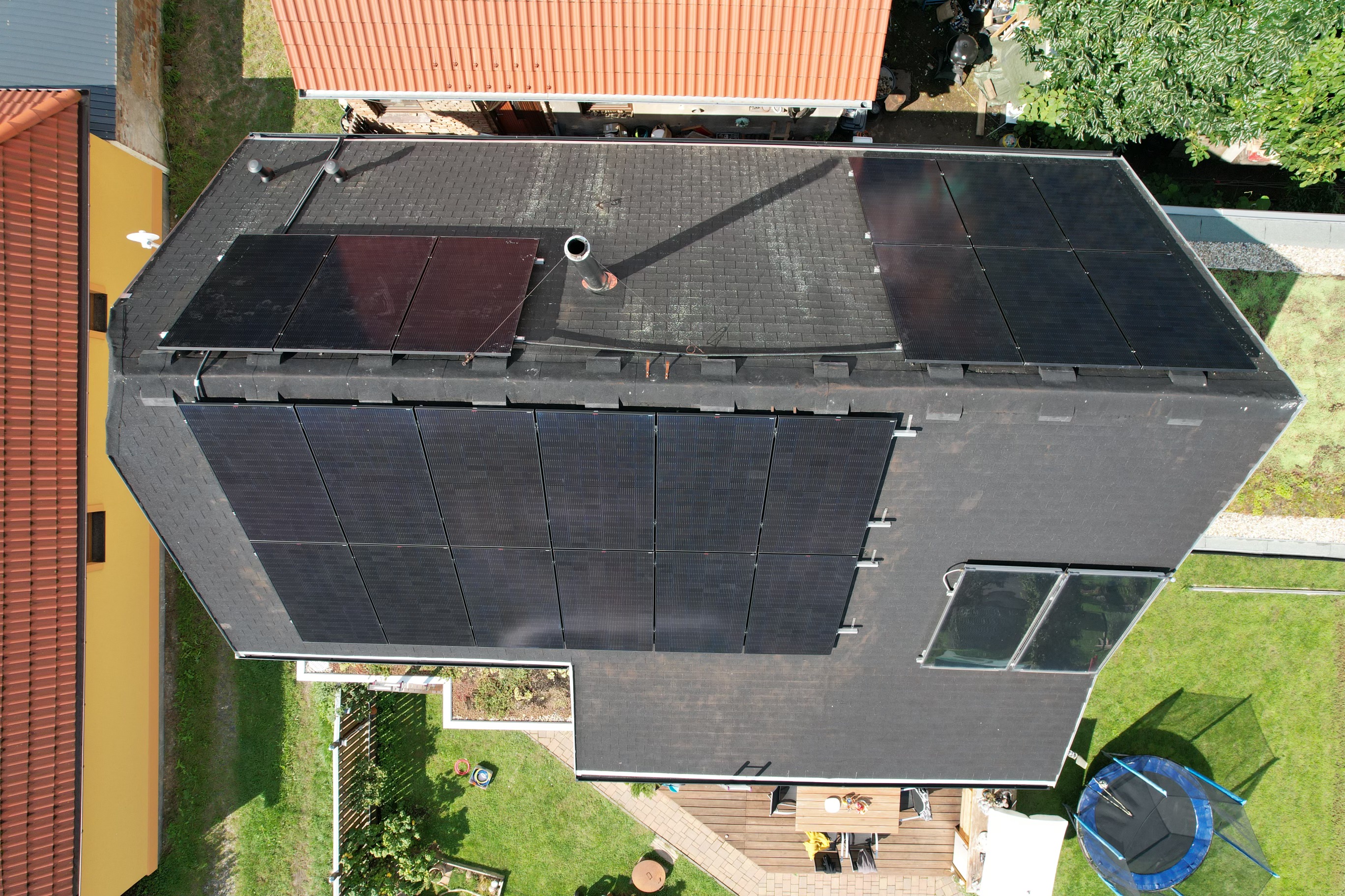 Instalace fotovoltaické elektrárny na rovné střeše rodinného domu a zahradního domku o výkonu 12,5 kW. Střídače, MPPT regulátory, řídící jednotka Cerbo a dobíjecí stanice pro elektromobily od značky Victron Energy. Bateriové úložiště BPS BATTERY STORAGE o deklarované kapacitě 21,1 kWh.