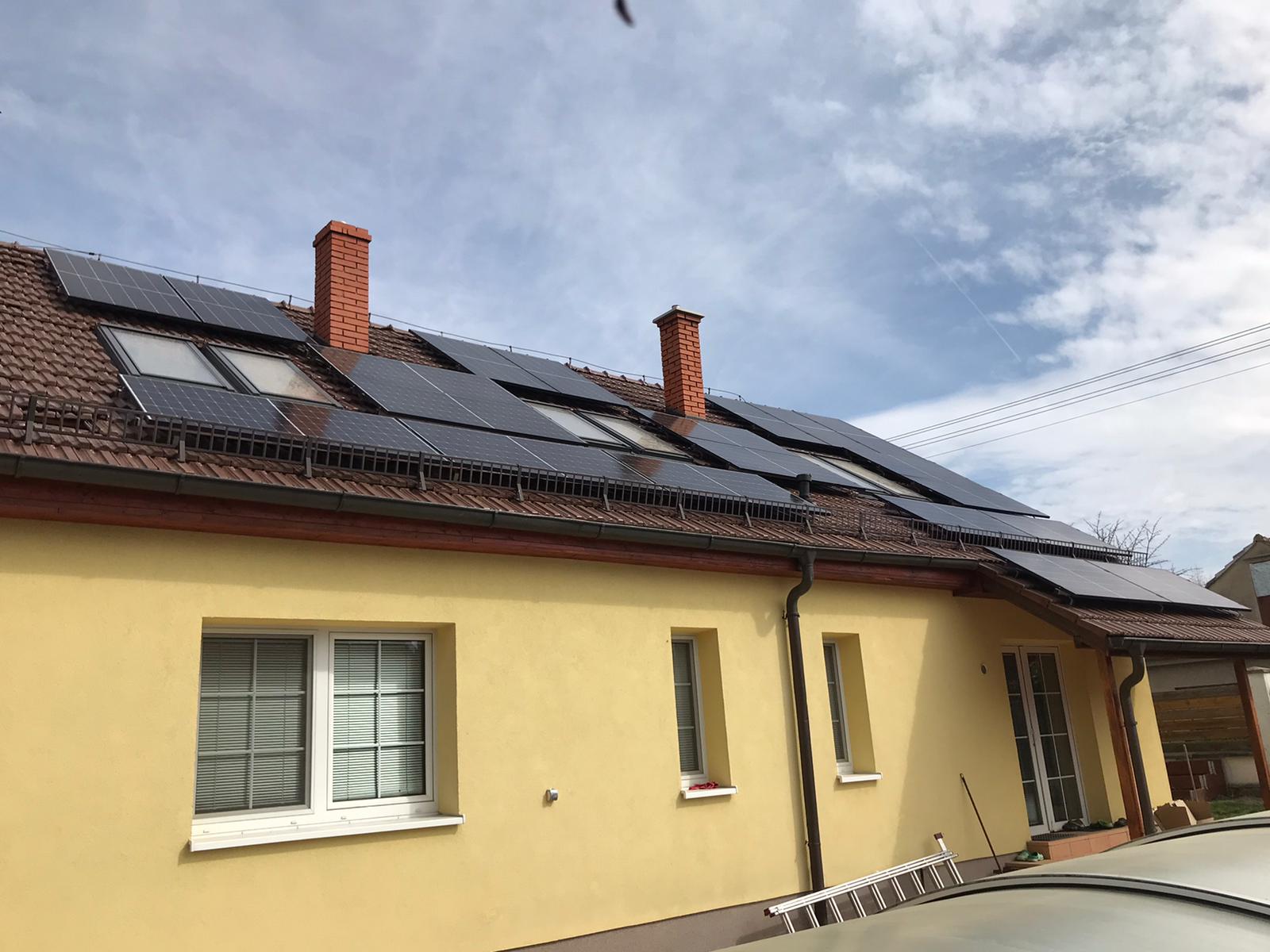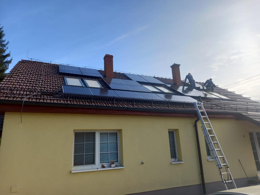 Instalace fotovoltaické elektrárny na sedlové střeše rodinného domu o výkonu 9,45 kW. Střídač 10 kW, bateriové úložiště o deklarované kapacitě 11,6 kWh a dobíjecí stanice pro elektromobily od značky DZD SOLAR.