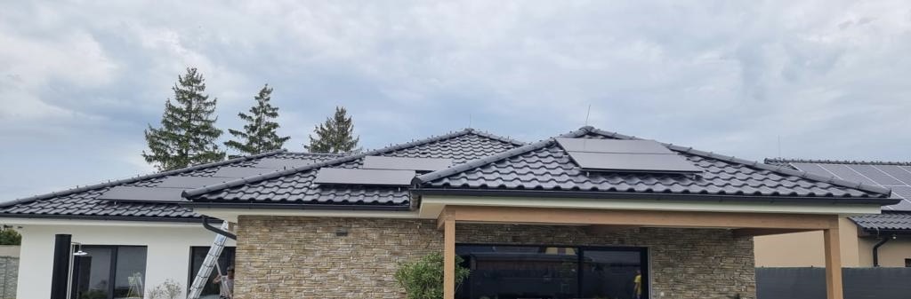 Instalace fotovoltaické elektrárny na sedlové střeše rodinného domu o výkonu 9,45 kW. Střídač 10 kW, bateriové úložiště o deklarované kapacitě 11,6 kWh a dobíjecí stanice pro elektromobily od značky DZD SOLAR.