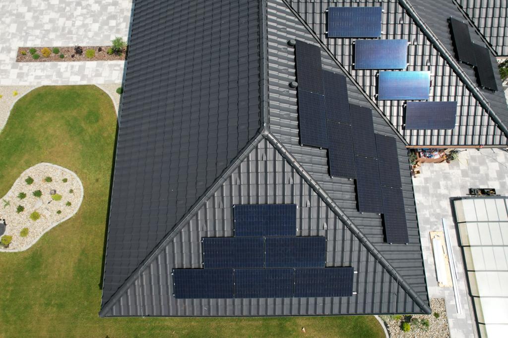 Instalace fotovoltaické elektrárny na pultové střeše rodinného domu o výkonu 10 kW. Střídač 10 kW, bateriové úložiště o deklarované kapacitě 11,6 kWh a dobíjecí stanice pro elektromobily od značky DZD SOLAR.